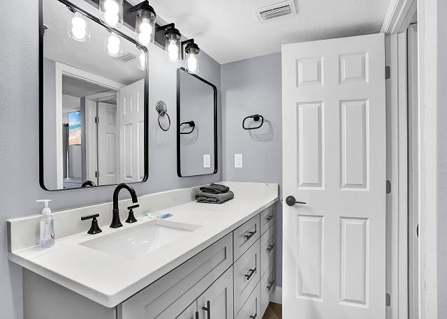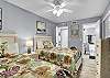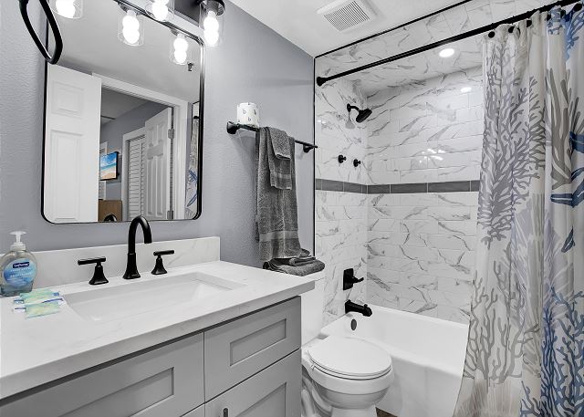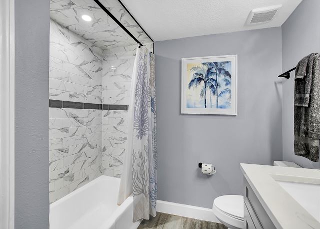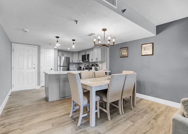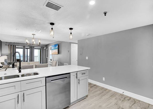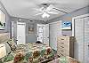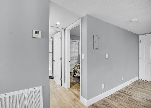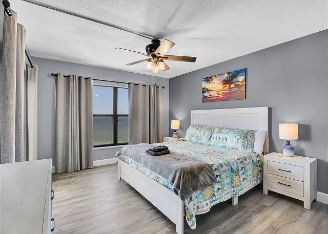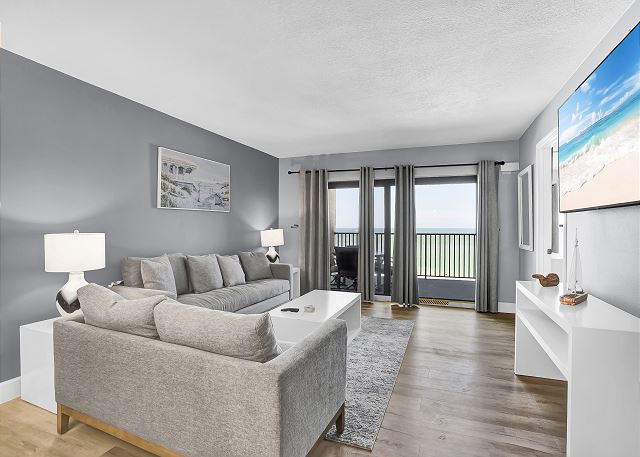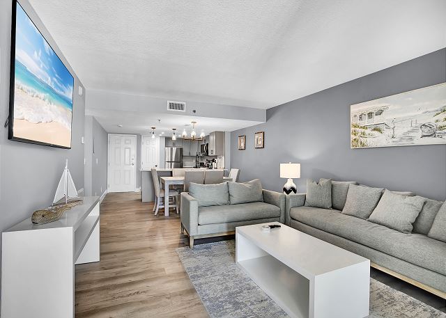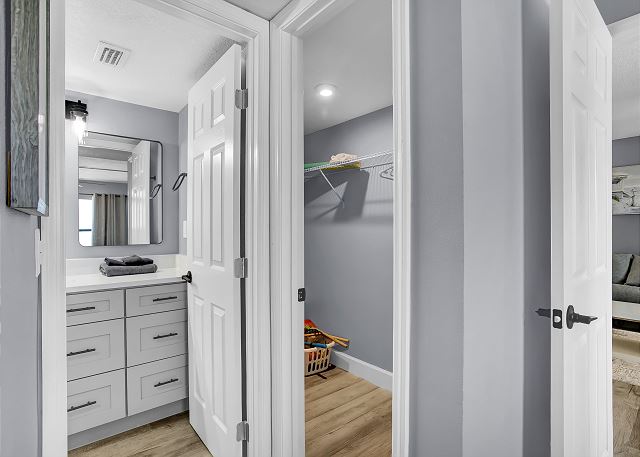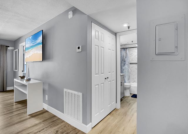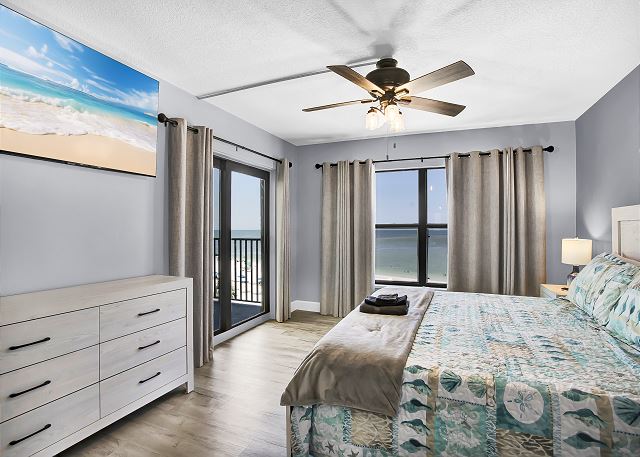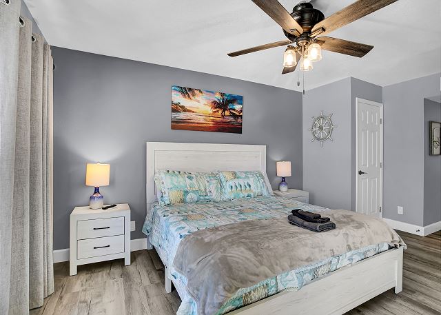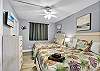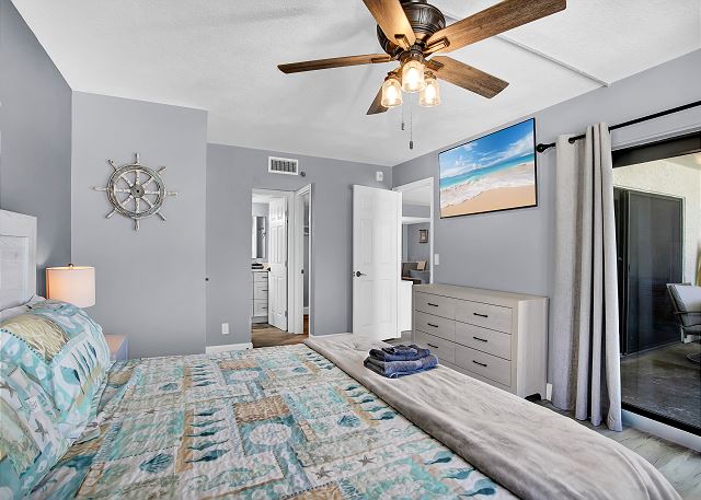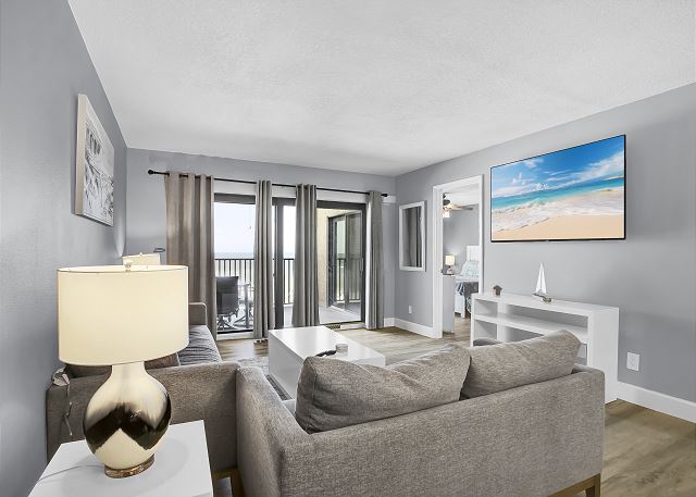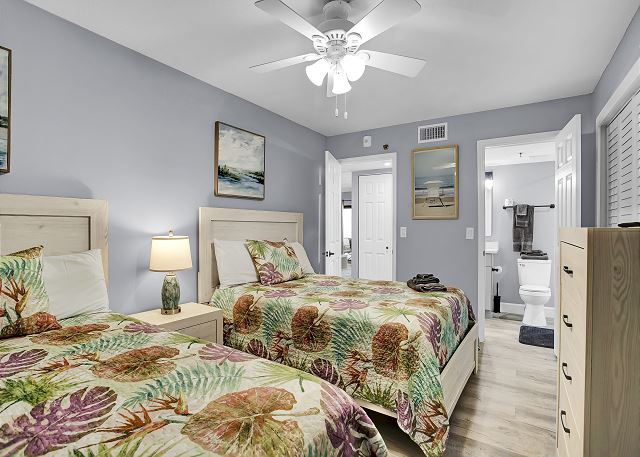 The master bedroom boasts a king bed, dresser, Smart TV, walk-in closet, and a large window with stunning beach views. A sliding glass door provides direct access to the private balcony. The guest bedroom includes two double beds, a chest of drawers, Smart TV, and a wall closet. Bed linens and bath towels are provided for up to six guests. Our friendly staff is available to assist with any needs or requests during your stay. Located directly across the street from John’s Pass Village and Boardwalk, you’ll be steps away from shops, cafés, restaurants, and fishing charters. Coin/Card operated washers and dryers are available on each floor. This is a non-smoking accommodation.