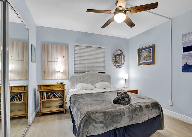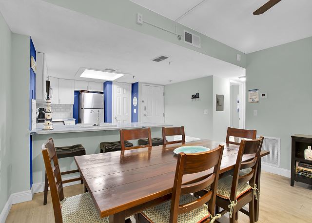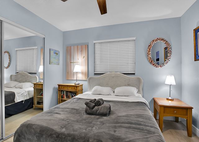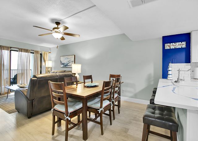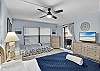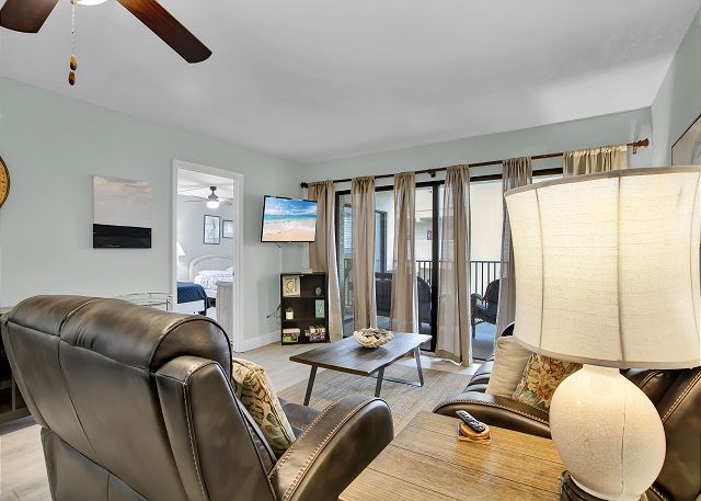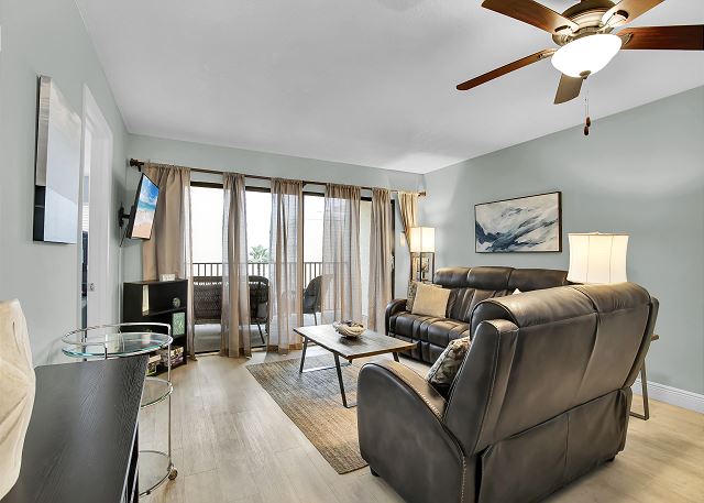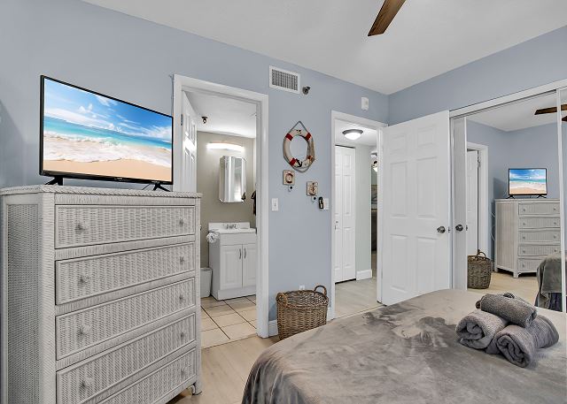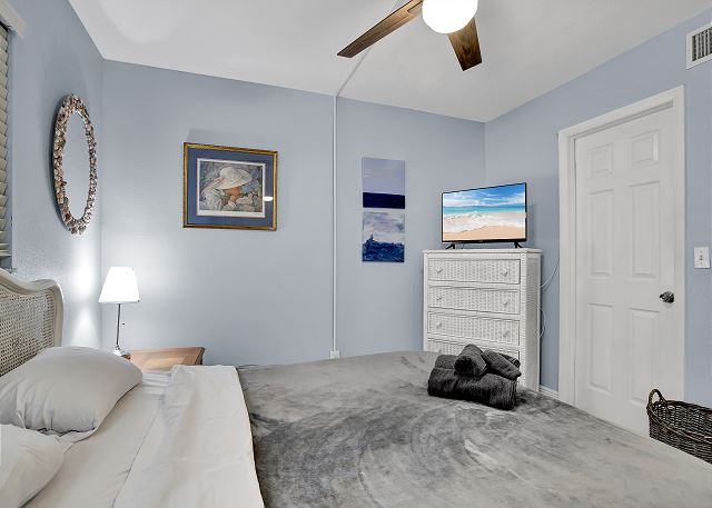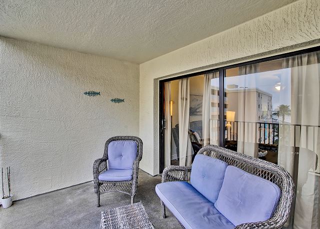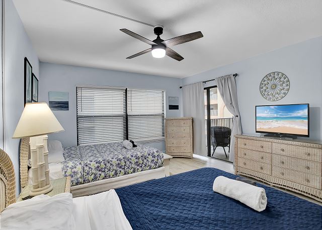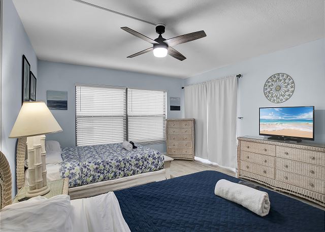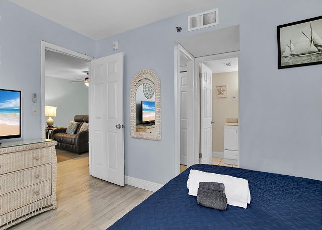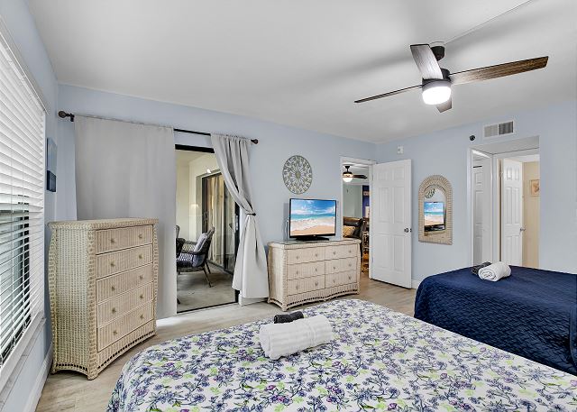 Step out onto your private balcony from either the living room or the master bedroom and take in the refreshing Gulf breezes. The condo comfortably sleeps up to 6 guests, with two queen beds in the master bedroom and one queen bed in the guest bedroom. Six sets of bath towels and all bed linens are provided for your stay.